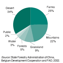 Beginning in 1978, the Chinese Government, through the Three North Shelterbelt Programme, established an extensive network of shelterbelts and plantation forests (the “Great Green Wall”) across northern China, with the objective of protecting agricultural and pastoral lands, as well as human settlements, from wind and water erosion. This programme proposed to plant shelterbelts and restore landscapes over 4.06 million square kilometres (of which 1.33 million square kilometres were desert lands) or 42 percent of the country’s area, which supports 170 million primarily rural, farm-based people (about 10 percent of the national population). The Three North Shelterbelt Programme objectives are to improve the soil and water conservation of the Three North Region, to moderate the effect of strong winds and desertification through increased forest and vegetation cover, and to enlarge the limited resource base for the increased production of industrial wood supplies and fuelwood to meet current and future wood requirements.