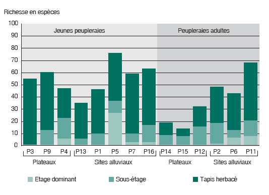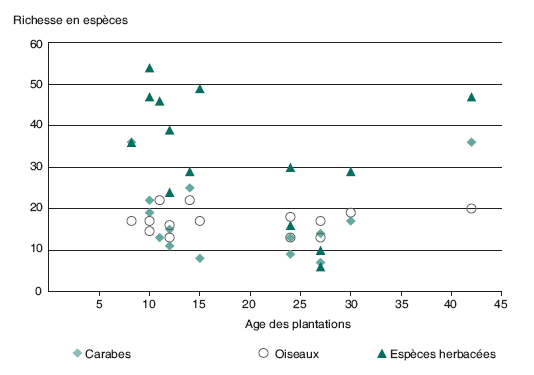 Des inventaires de biodiversité, réalisés en 2003 dans 16 peupleraies d’âges divers situées dans différentes localités de la Picardie (nord de la France), ont révélé l’existence d’un nombre impressionnant d’espèces. La diversité des espèces était élevée dans les trois composantes analysées, à savoir les carabes, les oiseaux et la végétation. L’inventaire a révélé la présence de 71 espèces de carabes sous les peupliers, en particulier sur les sites alluviaux. Leurs populations semblaient structurées en fonction de l’humidité du milieu, du couvert végétal et, dans une moindre mesure, du pH du sol. Certaines peupleraies ont été comparées à d’autres milieux voisins, et il en résulte que la richesse spécifique des peupleraies est supérieure à celle des forêts feuillues, et équivalente à celle des champs de céréales. L’indice de Shannon (abondance et uniformité des espèces) et l’indice d’équitabilité (distribution des espèces) étaient plus élevés dans les peupleraies et dans les forêts feuillues. Dans les champs de céréales, les populations de carabes étaient inégalement réparties. Les peupleraies semblaient capables d’accueillir à la fois des espèces des milieux ouverts et des espèces plus forestières dans des proportions à peu près équilibrées (tableau 1). L’étude a permis d’identifier 45 espèces d’oiseaux. En ce qui concerne ces communautés d’oiseaux, les peuplements de peupliers situés sur des sites alluviaux avaient une richesse et une diversité spécifiques plus élevées que les peupleraies situées sur des plateaux. La richesse et la diversité spécifiques diminuaient avec l’âge des plantations et la densité du couvert (tableau 2). L’avifaune était principalement constituée d’espèces universellement répandues dans les milieux de forêts denses (figure 1). Les espèces des milieux de forêts ouvertes se rencontraient plus fréquemment dans les jeunes peupleraies sans sous-étage. Il ne semblait pas y avoir d’avifaune spécifique aux peupleraies, hormis Oriolus oriolus, dont la présence a fréquemment été observée. Au total, 198 espèces herbacées ont été dénombrées. Malgré l’homogénéité de l’étage dominant, les communautés végétales étaient diversifiées, probablement à cause de la variété des sites, des sols et de la végétation précédente. La richesse en espèces herbacées était plus élevée dans les jeunes peuplements de peupliers et plus faible dans les peuplements adultes, en particulier sur les plateaux (figure 2). La grande diversité des espèces pourrait être due aux conditions favorables des sites alluviaux sur lesquels les peupliers sont cultivés, notamment à la disponibilité d’eau et de nutriments. Les opérations d’entretien (discage, fauchage) semblaient renforcer la diversité des espèces, mais réduire la cohésion naturelle des communautés végétales, en permettant la présence de certaines espèces annuelles qui auraient été éliminées naturellement par la concurrence. Les augmentations des ressources disponibles (lumière, eau, azote) étaient bénéfiques non seulement pour les peupliers cultivés, mais aussi parfois pour les espèces héliophiles qui concurrençaient fortement d’autres espèces herbacées (par exemple Rubus spp. sur les plateaux). En résumé, la richesse en espèces des peupleraies picardes varie selon les sites, mais elle est dans l’ensemble élevée pour les trois composantes examinées. L’âge des peuplements semble avoir une influence sur la richesse spécifique des carabes et de la végétation (mais être sans effet sur celle des oiseaux (figure 3); elle tend à être plus élevée dans les jeunes peuplements et plus faible dans les peuplements adultes, mais elle se remet à augmenter si les peupliers ne sont pas exploités.