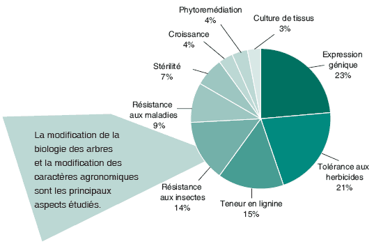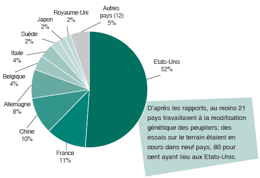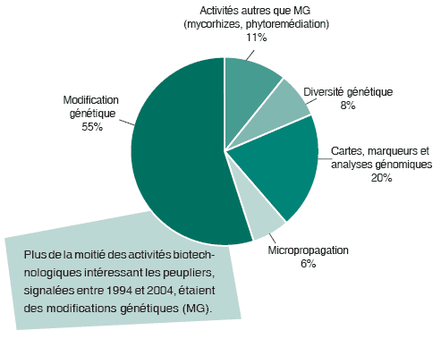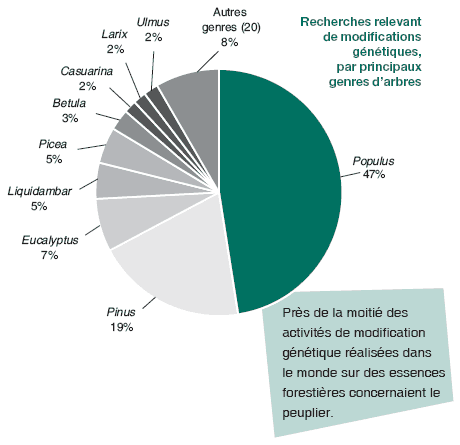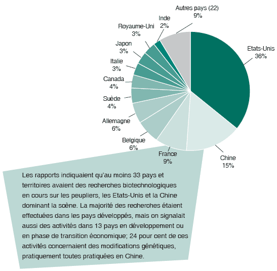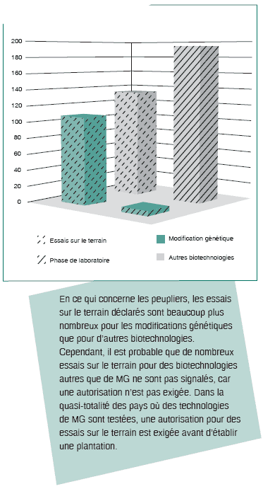 Le peuplier est considéré comme un arbre modèle dans les études sur la génétique et les biotechnologies forestières dans les régions tempérées et boréales, en raison de sa croissance rapide, de ses capacités de multiplication végétative (de nombreuses variétés peuvent être reproduites facilement par clonage), de l’expérience acquise dans les techniques classiques de sélection et de culture du peuplier, et de la structure génomique connue de cet arbre qui permet de l’utiliser en ingénierie génétique. La première essence forestière dont le génome complet a été séquencé était un peuplier; ce travail a été achevé en 2004 (Oak Ridge National Laboratory, 2004; JGI, 2004). Entre 1994 et 2004, Populus a été le deuxième genre d’essences le plus utilisé (après Pinus) dans les études de biotechnologie en général, et de loin le genre le plus largement utilisé dans les modifications génétiques, partout dans le monde. Le peuplier est la seule essence forestière génétiquement modifiée à avoir fait l’objet d’une distribution commerciale. L’Administration forestière publique de la Chine a approuvé la plantation commerciale de peupliers génétiquement modifiés en 2002; à la fin de cette année-là, plus de 1,4 million de peupliers génétiquement modifiés résistant aux insectes avaient été plantés dans ce pays, selon les rapports. Les graphiques et les statistiques figurant dans cet article sont tous fondés sur le nombre d’activités (en cours ou achevées, indépendamment du coût, de la taille du projet ou de la zone des démonstrations) signalées dans les ouvrages scientifiques internationaux, y compris les séries de données publiées entre 1994 et 2004 (FAO, 2004).
