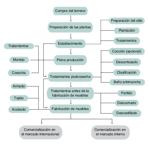 En vista de esta situación el Instituto de Investigación Forestal de Chile (INFOR), en colaboración con universidades y otras instituciones nacionales y con financiamiento del Fondo de Fomento al Desarrollo Científico y Tecnológico (FONDEF), ejecutó de 1997 a 2003 un proyecto para promover el desarrollo del sector del sauce-mimbre chileno. El objetivo era mejorar la calidad del producto, desarrollar el mercado interno y aumentar las exportaciones de materia prima y de productos, en particular muebles. Se abarcaba la totalidad del sector, desde la artesanía en pequeña escala hasta la industria del sauce-mimbre (véase la Figura).
