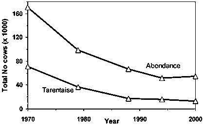 At the same time the population of the two local cattle breeds Abondance and Tarentaise decreased dramaticaly (Figure 3). From the early seventies to the early nineties the reduction in the number of cows was 32% and 58% for the Abondance and Tarentaise breeds respectively which was higher than for the whole French dairy cattle herd (25%). In recent years the population size has decreased at a slower rate (Tarentaise) or has increased slighty (Abondance). In 2000 there were 57 700 Abondance cows and 13 500 Tarentaise cows mainly kept in mountain or high mountain areas.