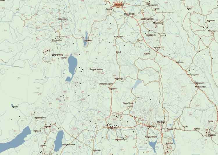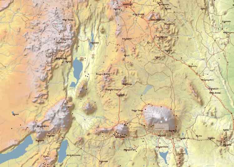 Figures 14.1a - 14.1c on the following pages demonstrate the base data components required for making a VrtlBM. The area surrounding Mount Kilimanjaro in northern Tanzania is again used in these graphics. Although the figures on the following pages include only baseline vectors derived from the VMap0/DCW and a 2.5d colour hillshade image, literally any of the data represented in the inventory could be included in a VrtlBM. Figure 14.1c also includes the NGA-GNS gazetteer location for Mount Kilimanjaro. VrtlBMs represent a very simple and cost-effective way to provide rapid spatial referencing when used in conjunction with gazetteer data such as the NGA's GEOnet database: on-line using IMS server interfaces; on the desktop using a "free" mapping programme such as ArcExplorer or even common Internet browsers; or again via handheld GPS units or those linked to a laptop computer.