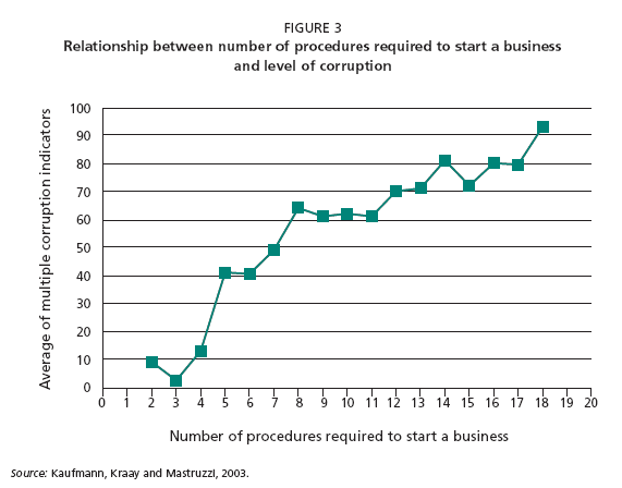 Avoiding regulatory proliferation. Several of the case studies already referred to show that there is often a correlation between how numerous regulations are, and how big corruption and the "informal" (or illegal) economy are (see Figure 3). Developing countries tend to have an overabundance of regulations (World Bank, 2004). Regulatory proliferation is often an indicator of a weak policy framework which does not adequately address the long-term vision for the forestry sector. This multiplies the risk of legal inconsistencies, contradictions and overlapping jurisdictions and complicates the understanding of the regulatory regime affecting the sector. All of this in turn allows for more discretionary decisions and, therefore, increased opportunities for corruption.