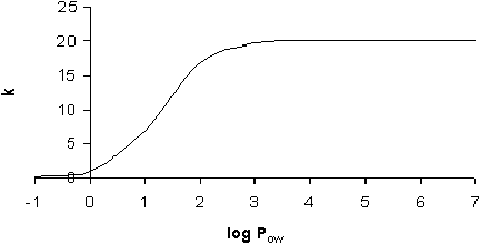 The partition constant k for fat and muscle (see Figure 7) can be calculated assuming Pow (octanol:water) has the same value as Plw, the partition constant for lipid and water. Further, if it is assumed that muscle contains 5% lipid with the remainder water and that fat is 100% lipid then: Plw = [lipid]/[water] » Pow; k = [fat]/[muscle]; k = [lipid]/(0.05*[lipid] + 0.95*[water]); k = (1-x)/{0.05*(1-x) + 0.95*x)} where x = 1/(1+Pow).