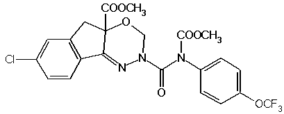 Indoxacarb is the ISO approved name for a new oxadiazine insecticide, methyl (S)-N-[7-chloro-2,3,4a,5-tetrahydro-4a-(methoxycarbonyl)indeno[1,2-e][1,3,4]oxadiazin-2-ylcarbonyl]-4'-(trifluoromethoxy)carbanilate (IUPAC), also known as methyl (4aS)-7-chloro-2,5-dihydro-2-[[(methoxycarbonyl)[4-(trifluoromethoxy)phenyl]amino]carbonyl]indeno[1,2-e][1,3,4]oxadiazine-4a(3H)-carboxylate (CAS).