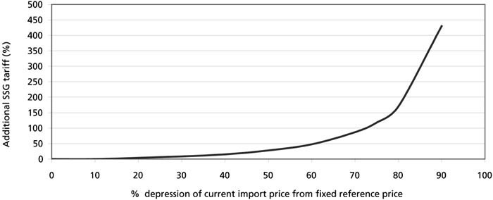 The formula for the price trigger of the SSG is shown in Box 1. In this formula, a safeguard is triggered when the current import price exceeds the trigger or reference price, which is fixed as the average import price for 1986 to 1988. Figure 1 illustrates how the formula works. Essentially, once the safeguard is triggered, the additional duty levied varies depending on the depth of the price depression. The figure also shows that the additional duty does not completely offset the fall in the import price. For example, additional duties would amount to 4 percent, 28 percent and 170 percent when the import price falls below the trigger price by 20 percent, 50 percent and 80 percent respectively.
