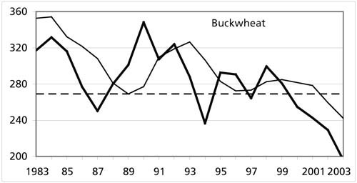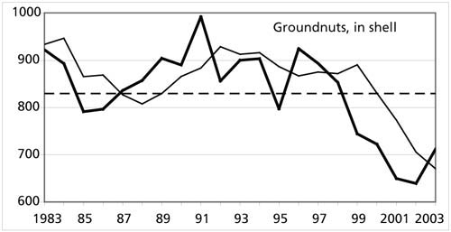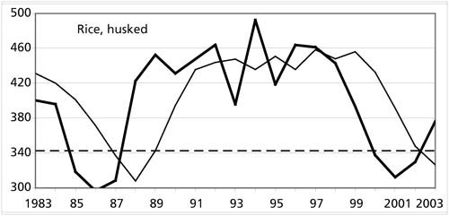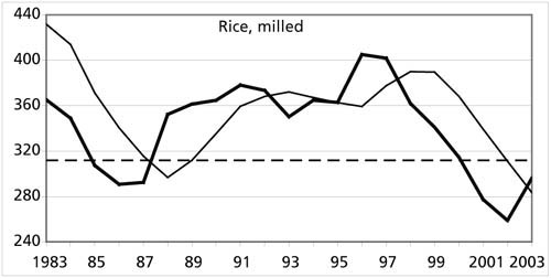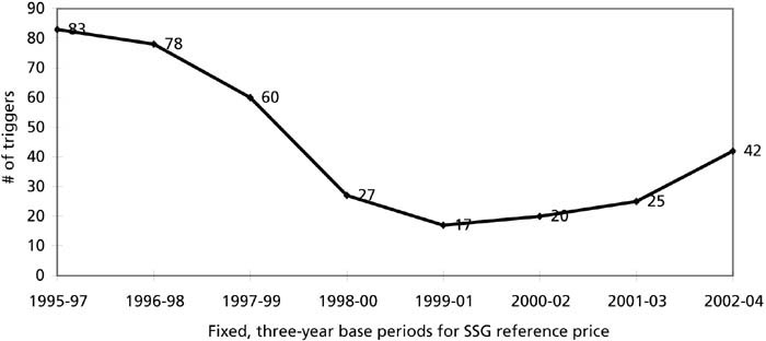 The challenge obviously lies in deciding on a particular period that is appropriate for a safeguard. Based on Figure 3, if the SSM is to cover exceptional cases only, then reference periods such as 1998-2000 or 2001-03 would appear appropriate because these reference prices cover the "exceptionally" depressed years observed around 1999-2001. On the other hand, while the reference periods of 1999-2001 and 2000-02 provide very little safeguard for the low years, reference periods such as 1995-97 or 1996-98 would trigger the SMM too frequently.