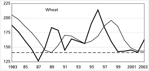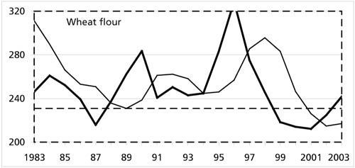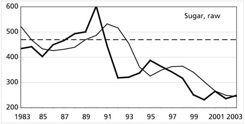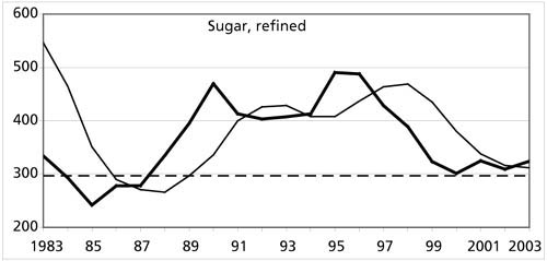 The problem with the MA-3 formula is apparent from the graphs. Taking raw sugar as an example, the MA-3 does not trigger a safeguard in 1985, a depressed year, nor in 2001 and 2003.[13] This is because current prices in 1999 and 2000 were already very depressed and as a result the MA-3 prices for the next two years were too low to trigger a safeguard. For wheat, the same thing happens in 2001 and 2002. Many cases like this can be found for the 10 commodities. The case of refined sugar is similar for the three years, 2001 to 2003, when the MA-3 does not trigger a safeguard despite these being years of depressed prices. Overall the MA-3 did not trigger a safeguard in about 20 percent of the cases when prices were depressed. This is the main limitation of the MA-3 reference price.