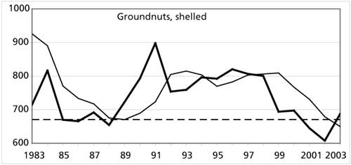 In order to illustrate these points, world market prices (unit import prices) for 10 primary and processed agricultural products over 21 years were analysed. Figure 2 plots actual prices against two reference prices - a three-year moving average (MA-3) price as in the G-33 proposal, and 1986-88 average price (the SSG reference price).