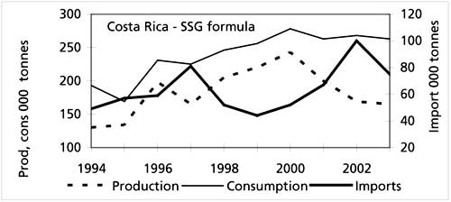 In disputes involving the Safeguards Agreement, panels have generally decided whether a surge exists or not by first looking at the data on import trends. For example, the 56 000 tonnes increase in imports in Costa Rica between 1999 and 2002 would probably have been regarded as a surge by the dispute panel. Similarly for Guatemala between 1998 to 2001. Yet, in both cases, the SSG formula did not trigger a safeguard because the trigger import volume exceeded the current import volume.[16]