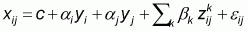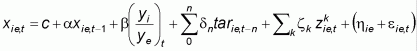 where xie,t, yi,t and ye,t denote exports from country i to the EU in year t and the GDP of the exporting country and the EU respectively in the same year. The variable tarie,t denotes the level of the ad valorem tariff faced by the exporting country in time t, whilst the k variables zij refer to several variables relating to natural tariff barriers. eie,t is a error term, whilst hie is an unobserved country-specific and time-invariant effect that can be thought of as an additional determinant of exports on the basis of characteristics that are peculiar to each country. The lagged dependent variable and the lagged tariff terms capture the adjustment process to the new environment.