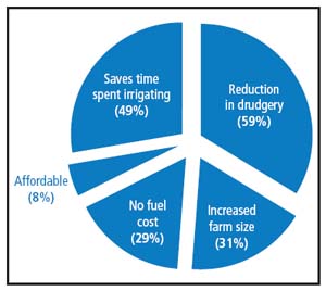 Factors that have influenced the adoption of this technology, as revealed by a recent survey conducted by IWMI in Ghana, includes drudgery reduction (59 percent), reduction of time used for irrigation (49 percent), increased farm size (31 percent), no fuel requirement (29 percent) and affordability (8 percent), as seen in Figure. Factors given by non-adopters are: non affordability (58 percent), use of TP is labor intensive (31 percent), lack of suitability for cultivating large farm sizes (19 percent), lack of awareness (15 percent) and unreliability of their source of water (4 percent).