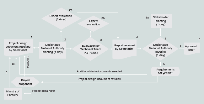 The Minister of Forestry must provide an approval or recommendation letter to the Designated National Authority explaining that the proposed CDM project will contribute to sustainable development in forestry. However, the passage through the Ministry of Forestry will not add to the total time period for getting approval from the Designated National Authority, since part of the project screening will already have been done by the ministry (Figure 3). Furthermore, since the project concept note needs to include many aspects that are to be covered in the project design document, this procedure will actually reduce the workload in project design document preparation.