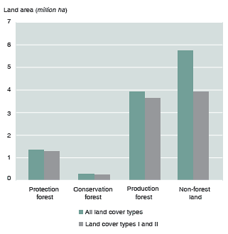 Between 1990 and 2000, Indonesia lost approximately 1.3 million hectares of its forest per annum (FAO, 2001). Indonesia’s Ministry of Forestry (2003a) estimated that 96.3 million hectares of the country’s land area was degraded, including 54.6 million hectares of degraded forest in need of rehabilitation (Figure 1).