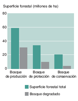 Entre 1990 y 2000, Indonesia perdió aproximadamente 1,3 millones de hectáreas de bosque por año (FAO, 2002). El Ministerio de Bosques estimó que 96,3 millones de hectáreas de la superficie de tierras del país estaban degradadas (Ministry of Forestry, 2003a); esa cifra incluía 54,6 millones de hectáreas de bosque degradado que debían ser rehabilitadas (Figura 1).