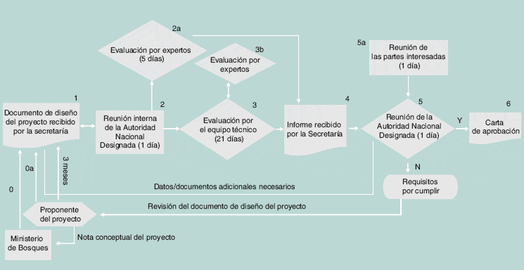 En virtud de un decreto adoptado por el Ministerio de Medio Ambiente en 2005, el proceso de aprobación nacional de proyectos del MDL tarda 30 días a condición de que se cumplan todos los requisitos (Figura 2). Sin embargo, el procedimiento de solicitud de autorización para realizar proyectos de forestación o reforestación del MDL es distinto que el que se aplica a los proyectos de otra índole en el marco del mecanismo. Mientras que los proponentes de este último tipo de proyectos pueden someter el documento de diseño del proyecto y otra documentación necesaria directamente a la Autoridad Nacional Designada, el Reglamento del Ministerio de Bosques P.14/2004 especifica que los proponentes de proyectos de forestación o reforestación deben obtener una autorización o recomendación del Ministerio de Bosques para poder presentar un documento de diseño del proyecto a la Autoridad Nacional Designada. El proponente debe presentar tres documentos al Ministerio de Bosques: