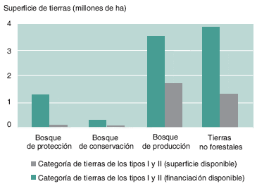 Se necesitan cuantiosos fondos para restaurar la extensa superficie de bosque degradado. Dado que con los fondos nacionales disponibles actualmente sólo es posible financiar las actividades de rehabilitación en 3 millones de hectáreas entre 2003 y 2007, es necesario estudiar la posibilidad de obtener otras fuentes de financiación para la rehabilitación forestal. El Mecanismo para un desarrollo limpio (MDL) previsto en el Protocolo de Kyoto, que ofrece a los países en desarrollo la posibilidad de cooperar con países desarrollados en el empeño mundial de mitigar los efectos negativos del cambio climático mediante proyectos de establecimiento de sumideros de carbono, puede brindar apoyo para rehabilitar los bosques degradados.