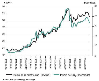 Existe una fuerte correlación entre los precios de las cuotas de emisión de CO2 y de la electricidad, siendo el coeficiente de correlación de alrededor de 0,95 (véase la Figura). El precio de un derecho de emisión era a comienzos de enero de 2005 ligeramente superior a 8 euros por tonelada de CO2, alcanzó un máximo de 30 euros en julio de 2005 y ascendía a 22 euros a mediados de septiembre de ese mismo año. El precio de la electricidad (precio de futuro en Alemania para 2006) era de unos 34 euros por megavatio-hora (MWh) en enero de 2005, de algo más de 45 euros en julio de 2005 y de 43 euros a mediados de septiembre. En el caso de la industria de la pasta y el papel, que compra unos 65 millones de MWh de electricidad por año, este aumento del precio de casi el 25 por ciento supondría un costo adicional de 780 millones de euros. El impacto es de extraordinaria magnitud y carece de justificación ambiental. Dado que estamos todavía en el período de «prueba», probablemente los productores de pasta de papel deberían pedir que se les devolviera su dinero.