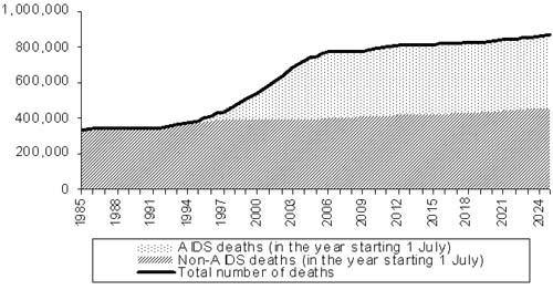 Figure 30 shows that the projected total number of deaths increased as a result of the gradual increase in non-AIDS deaths and the rapid increase in AIDS deaths during the late 1990s. In 2004, the model estimates 389 000 non-AIDS deaths and 311 000 AIDS deaths. The total deaths in 2004 were 701 000, i.e., about 44 percent of total deaths were AIDS deaths. The proportion of AIDS deaths to total deaths is fairly constant over the time span depicted in Figure 30.