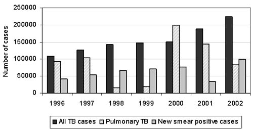 In 2002, there were an estimated 243 000 cases of TB in South Africa, making it the country with the seventh highest number of TB cases. The number of TB cases, as well as the number of new smear cases, nearly doubled between 1996 and 2002 (Figure 31). The rise in the number of reported TB cases since the inception of the National TB Control Programme in 1996 reflects a real increase in the number of cases, as well as improved case detection and reporting. The real increase in the number of cases is largely because of the rising prevalence of HIV. HIV infection is now the main single risk factor for TB, and in 2003/2004 more than half the smear-positive TB patients were HIV-positive.