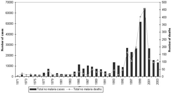 For the period 1976 to 1995, annual reported malaria cases ranged from 2 000 to 13 000 per year. In 1996, slightly more than 27 000 cases were reported, rising to more than 60 000 in 2000. The number of notified malaria cases decreased considerably thereafter (Figure 32). The malaria vectors resistance to existing pesticides, as well as antimalarial drug resistance, in part caused the dramatic increases in numbers of cases and deaths from malaria. Changes in the drugs and insecticide used contributed to the subsequent significant decrease in malaria morbidity and mortality in South Africa in subsequent years.