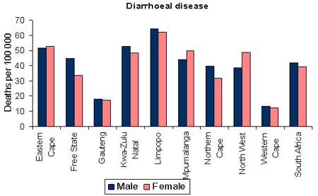 SANBD found that diarrhoea accounted for nearly 3 percent of all deaths in South Africa in 2000. However, death rates for diarrhoeal disease vary by province, ranging from 12 per 100 000 in the Western Cape to more than 60 in Limpopo Province (Figure 33). The average rates for South Africa are about 42 per 100 000 for males and slightly fewer for females. Clearly, in some provinces deaths from diarrhoea still make a significant contribution, affecting infants, children and the elderly in particular. Serious cholera outbreaks have occurred in recent years, affecting areas where there are poor water supplies and no sanitation. However, the case fatality rates during these outbreaks have been remarkably low.