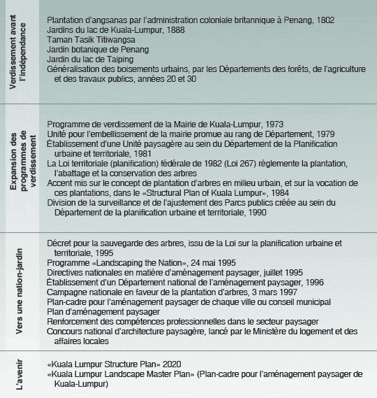 Cette évolution se divise sommairement en trois phases: le début du verdissement avant l’indépendance; l’expansion de ce programme dans les années 70, 80 et 90; et la campagne pour une «nation-jardin» de la dernière décennie (figure 1). Au cours de cette période, la sélection des espèces et les pratiques de plantation et d’entretien des arbres ont beaucoup changé dans les villes malaisiennes, marquant une sorte de transition vers des pratiques arboricoles améliorées.