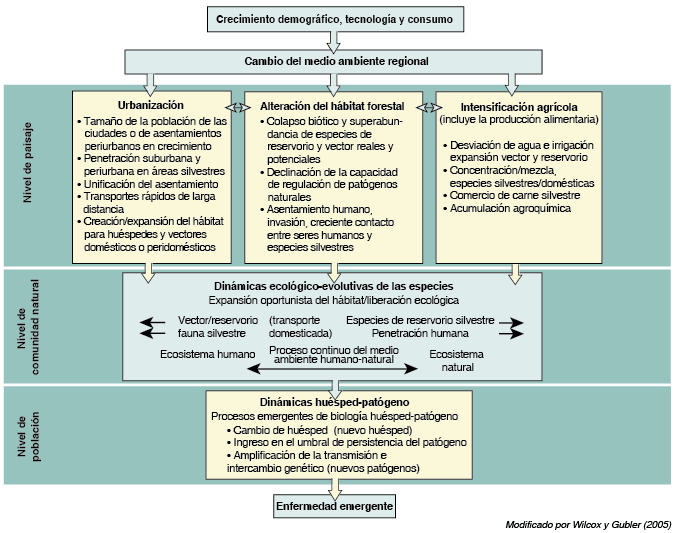 Las tres categorías de la utilización de la tierra –urbana, agrícola y hábitat natural– representan una serie de ecosistema junto con un gradiente de lo doméstico a lo natural (de izquierda a derecha en el diagrama). Se asocian con estas tendencias tres cambios: vectores y domesticación de reservorios (o peridomesticación); invasión del hábitat doméstico por especies oportunistas de la fauna silvestre como los roedores y los artrópodos succionadores de sangre (mosquitos, garrapatas, jejenes y otros); e invasión del hábitat natural por especies silvestres como cerdos domésticos, cabras, ratas, ratones, perros y gatos. Estas especies se transforman en receptores de agentes patógenos especialmente en los bosques alterados y fragmentados adyacentes a asentamientos. La convergencia de seres humanos y huéspedes animales y reservorios y especies de vectores dentro de ecosistemas y el movimiento, cambio y mezcla a través de la serie del ecosistema afecta a la dinámica huésped-agente patógeno de un modo que facilita la aparición de la enfermedad de la siguiente manera: