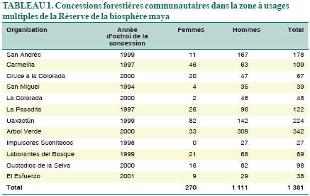 La Réserve de la biosphère maya couvre une superficie de 2,1 millions d’hectares, subdivisée en trois zones: une zone de base, consistant en parcs nationaux et biotopes protégés; une zone à usages multiples, où sont octroyées des concessions forestières; et une zone tampon, où une partie des terres appartient à des coopératives et des ejidos municipaux (terres publiques administrées par le gouvernement municipal), mais où l’utilisation du sol est généralement réglementée, même sur les propriétés privées (Carrera et al., 2006). En 2004, la zone à usages multiples comprenait 13 concessions forestières communautaires, deux concessions industrielles et huit coopératives. Douze des concessions forestières communautaires étaient assistées par le programme de conservation de la biodiversité et de développement forestier durable (BIOFOR) de l’Agence des États-Unis pour le développement international (USAID) et Chemonics International.