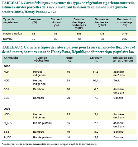 Les zones ripariennes situées le long du cours d’eau de Houay Pano sont recouvertes à plus de 43 pour cent d’une végétation herbacée et broussailleuse dominée par Microstegium ciliatum (appelée ici «herbe indigène»), alors que les bambous, en particulier Dendrocalamus sp. et Cephalostachium virgatum, n’occupent que 19 pour cent de ces zones. Les sites d’herbes indigènes et de bambous diffèrent par le couvert du sol et la canopée (tableau 1); leur efficacité en matière de filtrage des sédiments devait donc aussi logiquement différer. Le reste de ces zones ripariennes du bassin versant est recouvert de bananiers (15 pour cent), de forêts (15 pour cent), de manioc (6 pour cent) et d’herbe à éléphant (une espèce fourragère cultivée, Pennisetum purpureum) (3 pour cent).