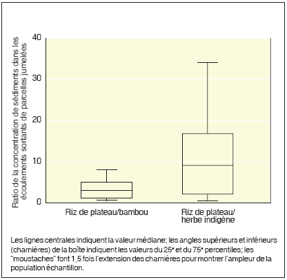 Les deux types de végétation étaient cependant de bien meilleurs filtres que le riz de plateau. La figure 2 montre des «boîtes à moustaches» du ratio de la concentration de sédiments dans les écoulements sortants mesurée dans des parcelles adjacentes, entre le riz de plateau (sites R_BB et R_NG) et le bambou ou l’herbe indigène (BB3 et NG3, respectivement) lors de 17 événements durant la saison de la mousson 2006. Le graphique montre que les ruissellements sortant des parcelles sous riz de plateau avaient une concentration en sédiments plus forte que les parcelles adjacentes. De fait, la concentration de sédiments dans les eaux de ruissellement sortant des parcelles de riz de plateau était en moyenne trois fois plus élevée que dans les ruissellements sortant du site de bambous adjacent, et neuf fois plus élevée que dans les ruissellements sortant du site d’herbes indigènes.