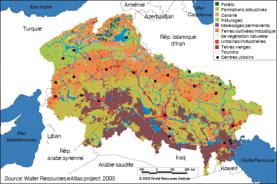Les eaux du bassin versant du Tigre et de l’Euphrate ont été pendant plus de 6 000 ans le siège de civilisations. S’étendant sur une superficie de 76,6 millions d’hectares, le bassin versant revêt une grande importance pour le bilan hydrique en Iraq, en République arabe syrienne et en Turquie, et pénètre aussi en République islamique d’Iran. Plus de 90 pour cent du bassin versant entre dans la catégorie des terres arides. Les forêts couvrent 1,2 pour cent de la superficie totale des terres (918 800 hectares), les cultures agricoles 25,4 pour cent et les herbages 47,7 pour cent (FAO, 2005, 2007; CESAO, 2002) (voir la carte). Les forêts étaient jadis plus denses et plus étendues, mais des siècles d’exploitation – aggravée par les conditions environnementales et économiques et une série de conflits – les ont amenuisées et ont modifié leur composition. Cinquante espèces arborescentes endémiques sont menacées d’extinction. Les ressources en eau du bassin versant sont souvent surexploitées, gaspillées et polluées. L’excès d’irrigation et l’inondation des champs ont haussé le niveau des nappes phréatiques et contaminé les sols avec l’eau salée qui peut causer l’échec des cultures et atteindre les cours d’eau. La forte dépendance vis-à-vis de l’agriculture, notamment des cultures irriguées, des engrais et des produits chimiques, associée aux sols largement sableux et gypsifères, a provoqué un lessivage massif de produits chimiques dans l’eau souterraine. Le pompage excessif des puits qui a suivi a aggravé le problème. La déforestation exerce aussi son impact sur la qualité de l’eau qui s’écoule à travers le bassin versant ou est stockée dans la nappe. La combinaison de la croissance démographique et des approvisionnements en eau fixes a diminué l’eau disponible par habitant. Les pays du bassin versant du Tigre et de l’Euphrate sont relativement riches en eau pour la région du Proche-Orient, où cette ressource est rare dans la plupart des endroits. Cependant, sa distribution inégale, la planification inadéquate de la construction des barrages et les taux élevés de prélèvement d’eau, pour l’agriculture en particulier, sont des sources de conflit et des entraves au développement économique. Avec une demande d’eau supérieure au volume hydrique total des deux fleuves, les disputes se sont multipliées dans les pays du bassin versant – par exemple, lorsqu’une intervention dans un pays était interprétée par l’autre comme une réduction de la disponibilité en eau. Un grand nombre des populations du bassin versant sont tributaires de fleuves qui traversent une frontière internationale avant d’arriver jusqu’à eux. Certaines n’ont pas accès aux fleuves et doivent recourir aux puits dont le niveau d’eau baisse ou à la coûteuse eau de mer dessalée. Vu les coûts qu’entraîneraient la relocalisation des ressources hydriques et la construction de nouveaux barrages, qui s’élèvent à des dizaines de millions de dollars, l’avenir même de certaines villes et de leurs industries pourrait être menacé. Afin de proposer des politiques appropriées de conservation et de gestion des forêts et de l’eau, il est essentiel d’étudier comment les forêts, l’eau et les populations peuvent établir entre elles des liens harmonieux.