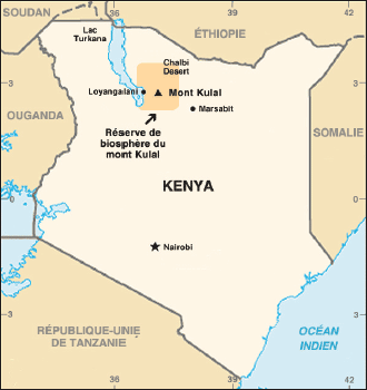 Le mont Kulal se situe au centre de la réserve du Programme sur l’homme et la biosphère (MAB) du même nom, qui est l’une des six réserves du MAB au Kenya. L’Organisation des Nations Unies pour l’éducation, la science et la culture (UNESCO) l’a désignée comme réserve MAB en 1979. Située dans le Kenya du nord, district de Marsabit, la réserve couvre une superficie d’environ 7 000 km² et s’étend de la rive orientale du lac Turkana, à travers des coulées de lave déchiquetées, jusqu’au sommet du mont Kulal, où se trouve sa zone centrale de 11 km². Dans la partie est et nord-est de cette zone centrale, la réserve plonge à travers des écosystèmes semi-désertiques jusqu’aux chaudes plaines du Chalbi Desert (voir la carte).
