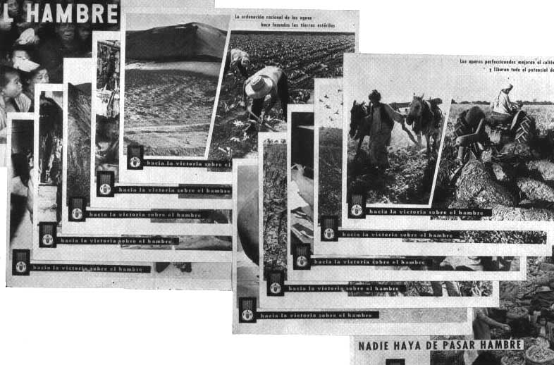 LA CARPETA DE MATERIALES para exposiciones sobre la Campaña, cuya cubierta se reproduce en esta página, contiene 12 planas gráficas murales. Cada plana mide 49 x 35 cm. y está dividida en dos secciones, la primera de las cuales pone de relieve alguna faceta de la agricultura que necesite rectificación, ilustrando la segunda lo que ya se ha hecho o se puede hacer para remediar la deficiencia señalada. Los temas que se tocan en el material contenido en la carpeta abarcan toda la estera de la agricultura. Puede solicitarse a la Organización de las Naciones Unidas para la Agricultura y la Alimentación (Campaña Mundial contra el Hambre), Roma.