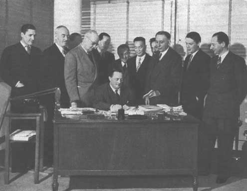 Sentado, en el centro: el Director Marcel Leloup (Francia). En primera fila, de izquierda a derecha: L.J. Vernell (Reino Unido); J.D.B. Harrison (Canadá); S.B. Show, Jefe Subdirección de Montes (EE.UU.); T. François (Francia), H. Scavenius (Dinamarca) R.G. Fontaine (Francia). Segunda fila: N. de Felsovanyi (Austria); E. Glesinger, Jefe, Subdirección de Productos Forestales (Austria); R.C. Fortunescu (EE.UU.), D.Y. Lin (China), J.P. Kagan (EE.UU.). Ausentes en la foto, M.A. Huberman (EE.UU.) y J. Vinzant (Francia).