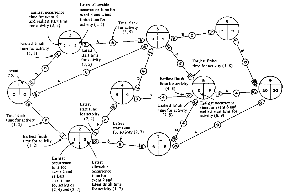 The only figures now missing are those for the small circles in the middle of each activity arrow. This space is for total slack and the values can be determined concurrently with the backward pass calculations. There are several ways of determining the value of total slack, but the simplest and most easily interpreted is that it is the difference between the earliest and latest finish times for an activity. On the diagram it is simply the difference between the value in the head box of an activity arrow and the value in the lower right side of the event circle indicating the termination of the activity.