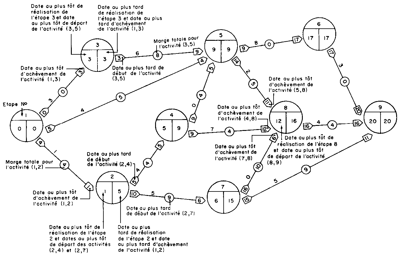 Toutes les activités comportant un zéro dans le cercle réservé à la marge totale constituent le chemin critique. Toutes les autres, ayant une marge supérieure à zéro, peuvent être retardées jusqu'à concurrence du chiffre indiqué sans retard dans l'achèvement du projet.