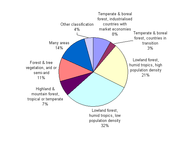 Figure 3.1 shows the breakdown of policy effects by forest/socio-economic classification and policy area. The majority of examples were of policies affecting lowland forest in the humid tropics which to a large extent reflects the current deforestation trends. The greater proportion of examples in countries with low population densities is probably related to higher forest cover. No notable differences in the proportions of examples concerning different policy groups were evident across classes.