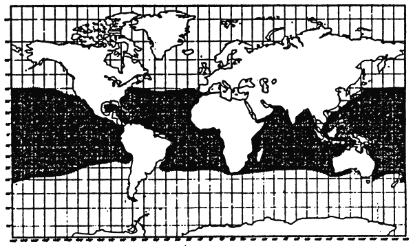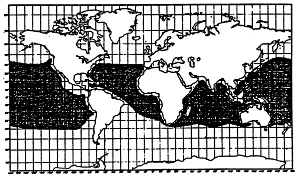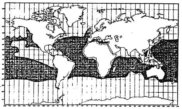 Geographical Distribution: Cosmopolitan in tropical and temperate waters of all oceans including the Mediterranean Sea, extending north to 45 to 50°N and south to 30 to 40°s, but not at the surface between 10°N and 10°S.