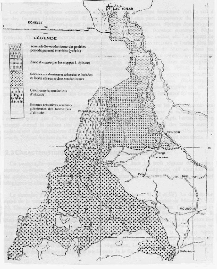 La flore (plantes supérieures) du Cameroun compte 7000 espèces dont 300 espèces de plantes ligneuses (Ministère de l'Environnement et des Forêts, 1995). L'unité phytogéographique comprise entre le Lac Tchad et la côte 800 m des pentes méridionales du plateau de l'Adamaoua, correspond à la région Soudano-Zambézienne de Letouzey (1968) cité par Donfack (1998). La région correspond, d'après Letouzey (op.cit.), à l'ensemble formé par trois phytochories qui sont du nord au sud: une zone de transition régionale sahélienne (secteur sahélien), un centre d'endémisme régional soudanien, qui comporte les secteurs sahélo-soudanien, soudano-sahélien et médio-soudanien, et une zone de transition régionale guinéo-congolaise/soudanienne (secteur soudano-guinéen).
