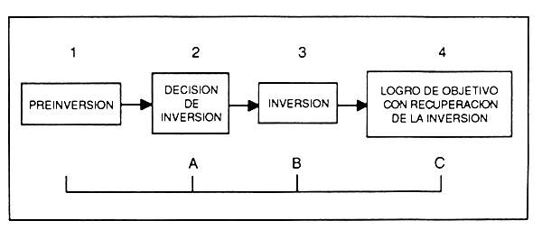 Como se aprecia, existe un orden estricto de las etapas (1 a 4) que conforman la conducta empresarial en el proceso de inversión, las cuales se retroalimentan (A, B, C) y, con ello, permiten formar base de datos, de experiencia o informativa, en beneficio del desarrollo de futuros proyectos, para aprovechar aciertos o evitar cometer errores.