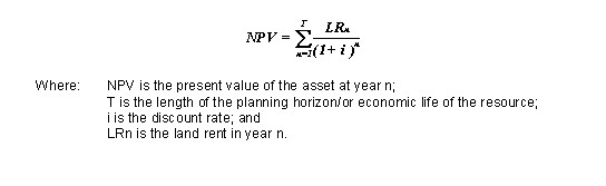 Land rent is obtained by estimating the annual net returns from the use of the resource over time, less a reasonable allowance for profit. In equation form, the net present value (NPV) of the asset (herein referred to as the asset value) is represented by: