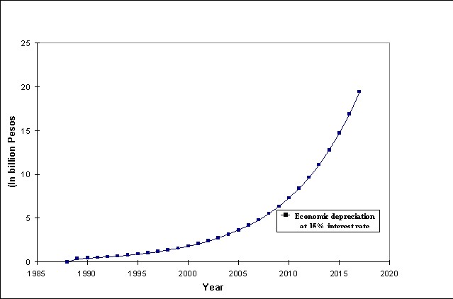 One will immediately notice that the value of soil nutrients in eroded soil far exceeds the economic depreciation estimates. In 1989, for example, at 10% discount rate, the value of soil nutrients was PHP 4.92 billion as against the PHP 1.47 billion estimate of economic depreciation. The economic depreciation estimate increases over the years as the asset value decreases over time The decreasing asset value was due to the declining period of accounting (i.e. in 1988 one considers stream of land rent in the next 30 years while in year 2000, the stream of land rent being counted is that due in the remaining 18 years of the 30-year life span) for the value of the asset.