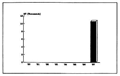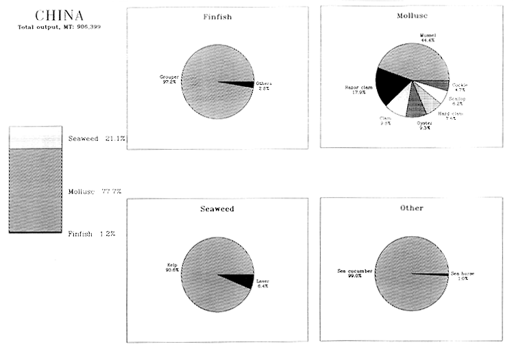 Scientists begun researching on the artificial propagation of Laminaria in the early 1950's. Having solved a number of biological and technical constraints, such as seedling rearing, Laminaria seafarming became the largest mariculture industry in China. To date there are over 7,200 hectares of kelp culture which extend from Liaoning to Fujian province. The annual dry weight production of kelp in China is the largest for any single marine species cultivated worldwide. Output peaked in 1980 with a dry weight production of 252,907 MT. Production in 1988 was 216,415 MT.