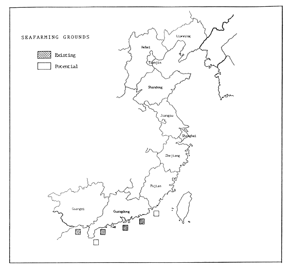 Two species of grouper are cultured in China: Epinephelus awoara and E. akaara. Groupers are mainly distributed in the South China Sea and constitute one of the most important finfish groups in the mariculture industry. Although grouper culture was first attempted over a decade ago it has developed only on a small scale. The supply of fingerlings is the major constraint to the further expansion of this seafarming activity. At present grouper fry are collected entirely from the wild as artificial breeding has not yet been successful. In 1987 over 10,500 MT were produced.