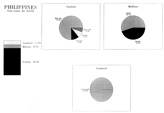 Milkfish is cultured almost all over the country. Culture of this species has been carried out for a long time. Culture techniques have recently been modified from the traditional extensive method to a more intensive one. The grow-out system varies according to pond design. Pond culture system also varies with freshwater pen culture. The latest breakthrough in seafarming of this species is the successful maturation of broodstock in floating netcages in selected geographic locations of the country. In 1986 almost 18,000 MT of table fish were produced.
