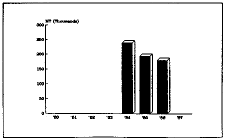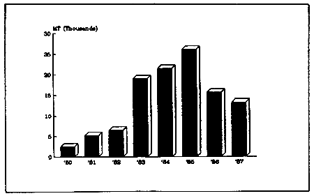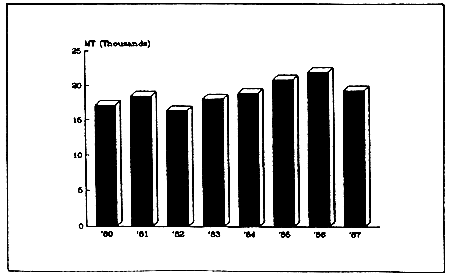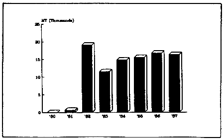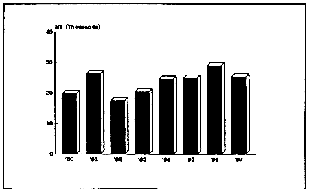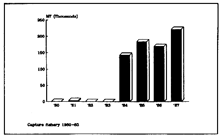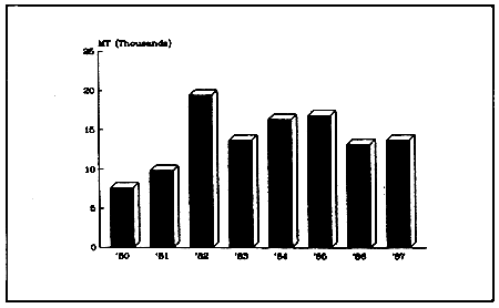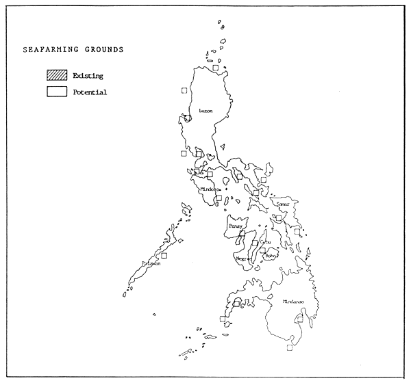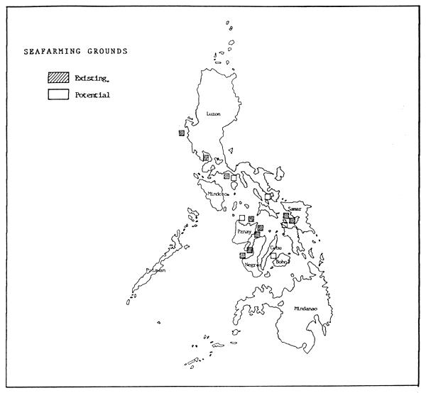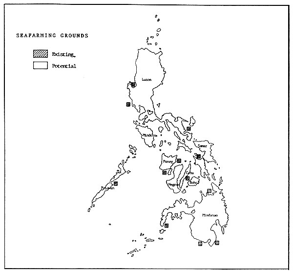 At present seaweed culture ranks third in the country among seafarming practices in terms of foreign exchange earning. In the early 60's, exported seaweeds derived mainly from harvests of wild stock. However, the low supply was not sufficient to satisfy the high international demand. As a result seaweed farming, particularly Eucheuma culture, was initiated in southern Philippines. At present Eucheuma is successfully cultured and over 221,000 MT were produced in 1987.