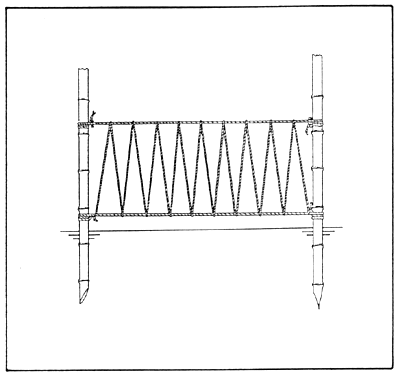 The stake method with several variations is the most commonly practiced culture method in the Philippines. Bamboo poles are commonly used as they are readily available and relatively cheap. These are sharpened at the thick end and pushed into soft muddy bottoms at water depths as deep as 10 meters. The stakes are spaced from 1.5 to 2 m apart and initially serve as spat collectors. One variation is the wig-wam method, with bamboo stake fixed in a circle, but slanted towards the center so that the top ends can be fastened together. The rope-web method is made of two 5-meter long ropes fixed horizontally (2 meters apart), and tied, at the ends, to two vertically fixed bamboo poles. A 40-meter long rope is then tied in a zig-zag fashion to the horizontal ropes providing a total of 50 meters of rope between the two stakes for mussel attachment. Although, mussel culture in the Philippines has been practiced for a considerable time, annual production is still rather low. Major constraints are environmental pollution and low price in the domestic market.