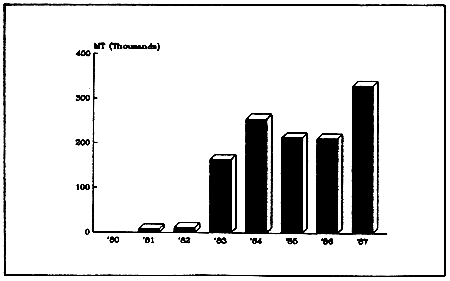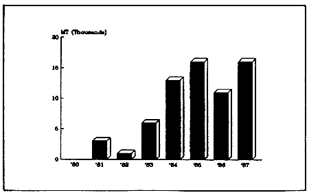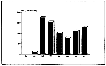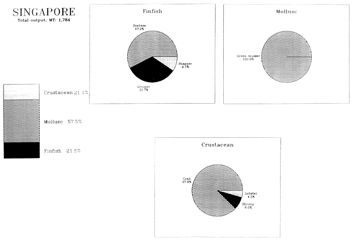 Mangrove crabs (Scylla serrata) are not cultured in the strict sense of the word as they are collected from the wild as adult specimens and placed in floating netcages for fattening and shell hardening. All of the crabs imported into Singapore come from Malaysia and Indonesia. Out of the 35 hectares being used by the seafarming industry, 5 are employed for crab farming. Over the last 5 years (1983–1988) production has increased from 163 MT to 256 MT with a peak production of 330 MT in 1987. Most of the crab production comes from the East Johore Strait (178 MT).