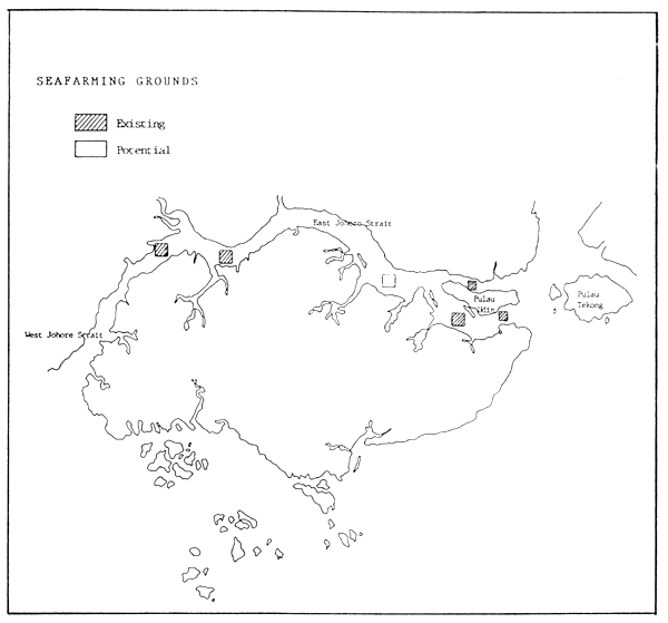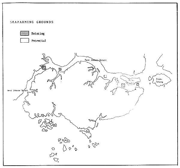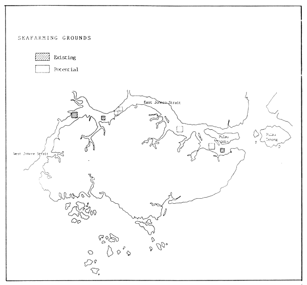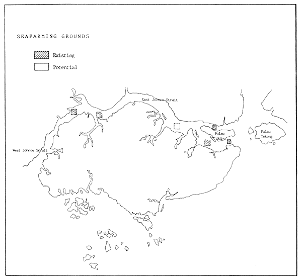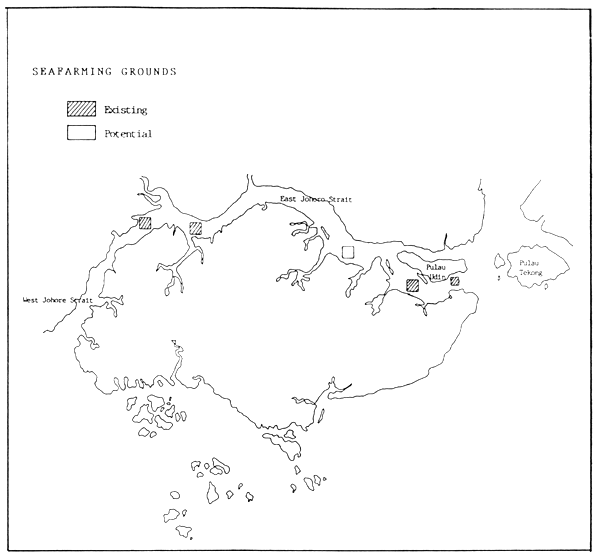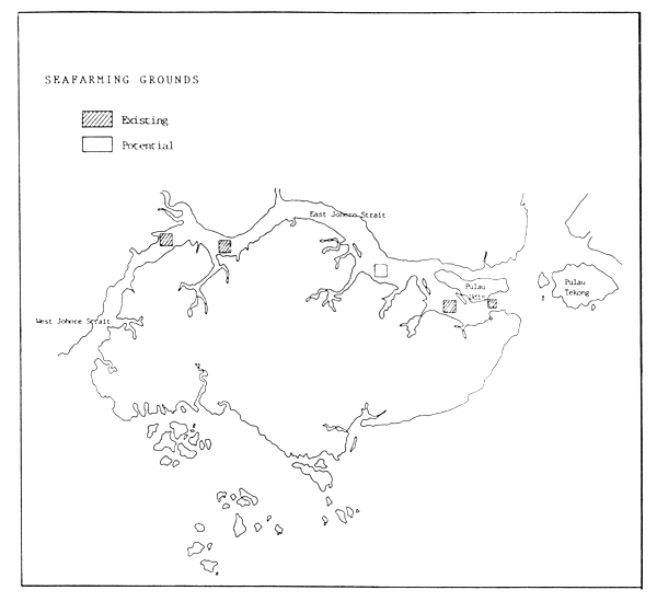 There are at present 70 floating fish farms, covering 35 out of 300 hectares of the available coastal seafarming area in Singapore. The total seafarming production in 1988 was 1,973 MT of which 23.9% derived from finfish mostly seabass (11.9%). Seabass is the most popularly cultured finfish in Singapore. Culture is done in floating netcages made of a simple wooden frame kept afloat by plastic buoys. A single farm is typically 1,500 m2 anchored in a water space of 5,000 m2. Netcages vary in dimension, however typical ones measure 2×2×2 m or 3×3×2-3 m or 5×5×2-3 m. Fingerlings are mostly purchased from Thailand and the Philippines, however a number of local hatcheries have recently been set up. Fingerlings of 2–5 grams are initially stocked at 100–150/m2 and then reduced to about 44/m2 when they have attained a body weight of 80–100 grams. Seabass are fed on chopped fresh trash fish and the Feed Conversion Rate (FCR) is typically around 5–7:1. Research studies on formulated feeds are being conducted by the Government. Culture period is 6–8 months when the fish have attained a body weight of 600–800 grams.